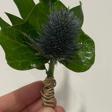 Buttonhole, featuring White Avalanche rosa, asparagus, ivy & eryngium.